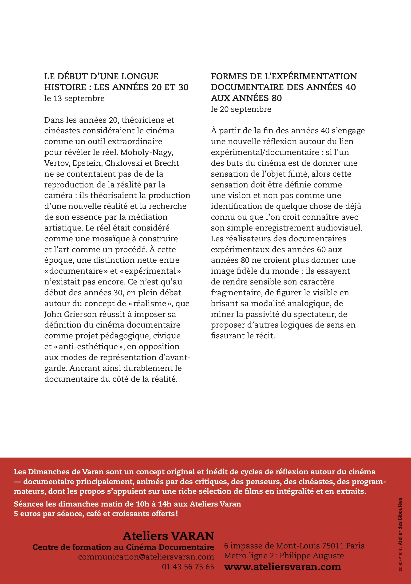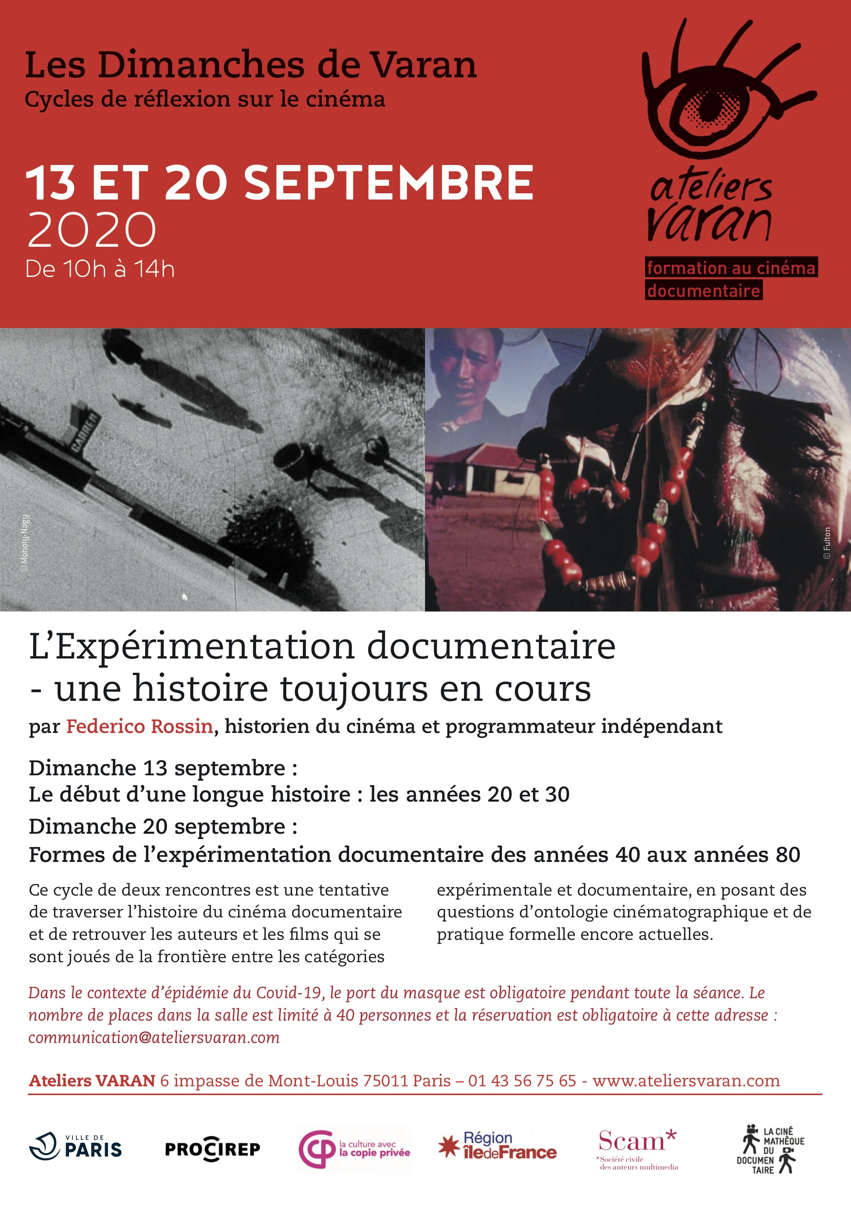 Après plusieurs mois d'absence en raison de la situation sanitaire, les Dimanches de Varan reprennent ! Mais dans des conditions particulières. Le port du masque est obligatoire pendant toute la séance et le nombre de spectateurs est limité. Il est désormais indispensable de réserver votre place par retour de mail ou à l'adresse communication@ateliersvaran.com.