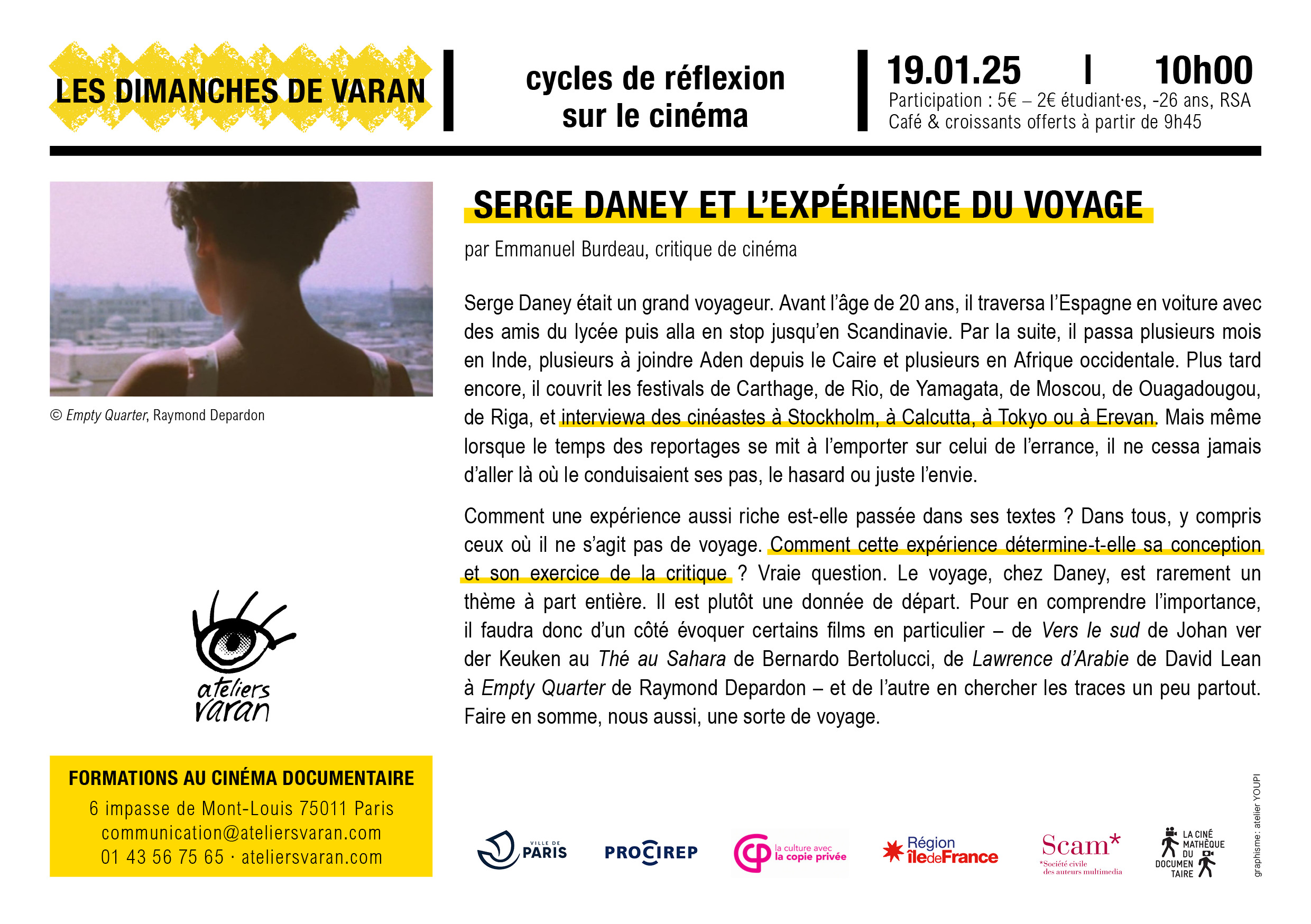 Comment une expérience aussi riche est-elle passée dans ses textes ? Dans tous, y compris ceux où il ne s’agit pas de voyage. Comment cette expérience détermine-t-elle sa conception et son exercice de la critique ? Vraie question. Le voyage, chez Daney, est rarement un thème à part entière. Il est plutôt une donnée de départ. Pour en comprendre l’importance, il faudra donc d’un côté évoquer certains films en particulier – de Vers le sud de Johan van der Keuken au Thé au Sahara de Bernardo Bertolucci, de Lawrence d’Arabie de David Lean à Empty Quarter de Raymond Depardon – et de l’autre en chercher les traces un peu partout.