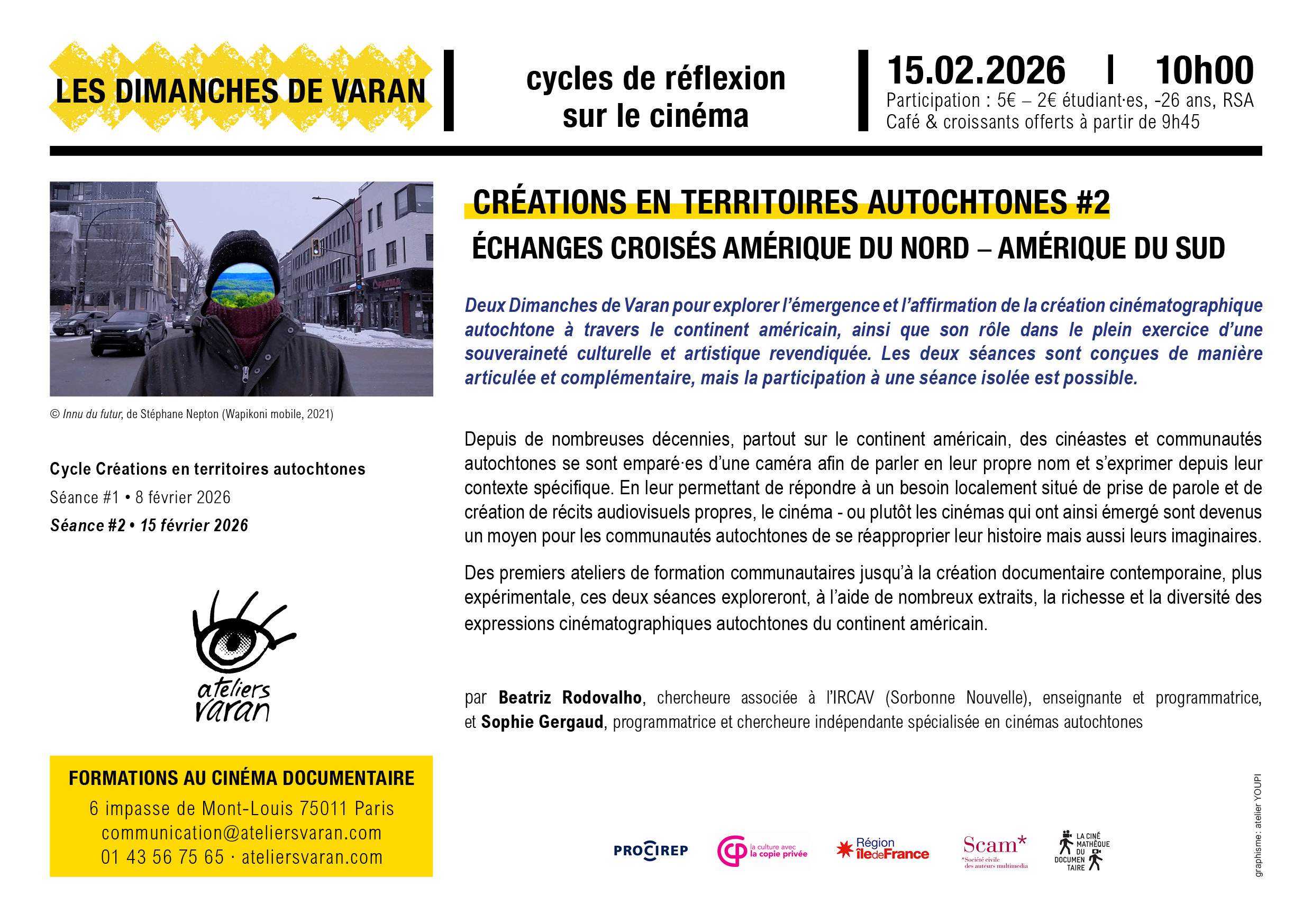 Deux Dimanches de Varan pour explorer l’émergence et l’affirmation de la création cinématographique autochtone à travers le continent américain, ainsi que son rôle dans le plein exercice d’une souveraineté culturelle et artistique revendiquée. Les deux séances sont conçues de manière articulée et complémentaire, mais la participation à une séance isolée est possible.