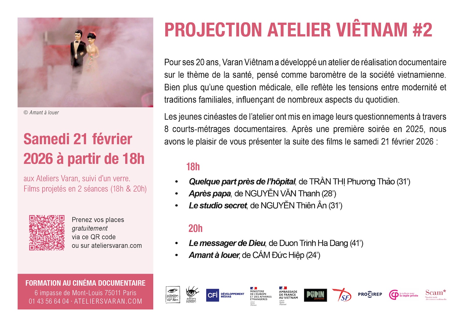 - Samedi 21 février à partir de 18h aux Ateliers Varan (6 impasse de Mont-Louis, 75011 Paris), Métro 2 Philippe Auguste ou Métro 9 Charonne