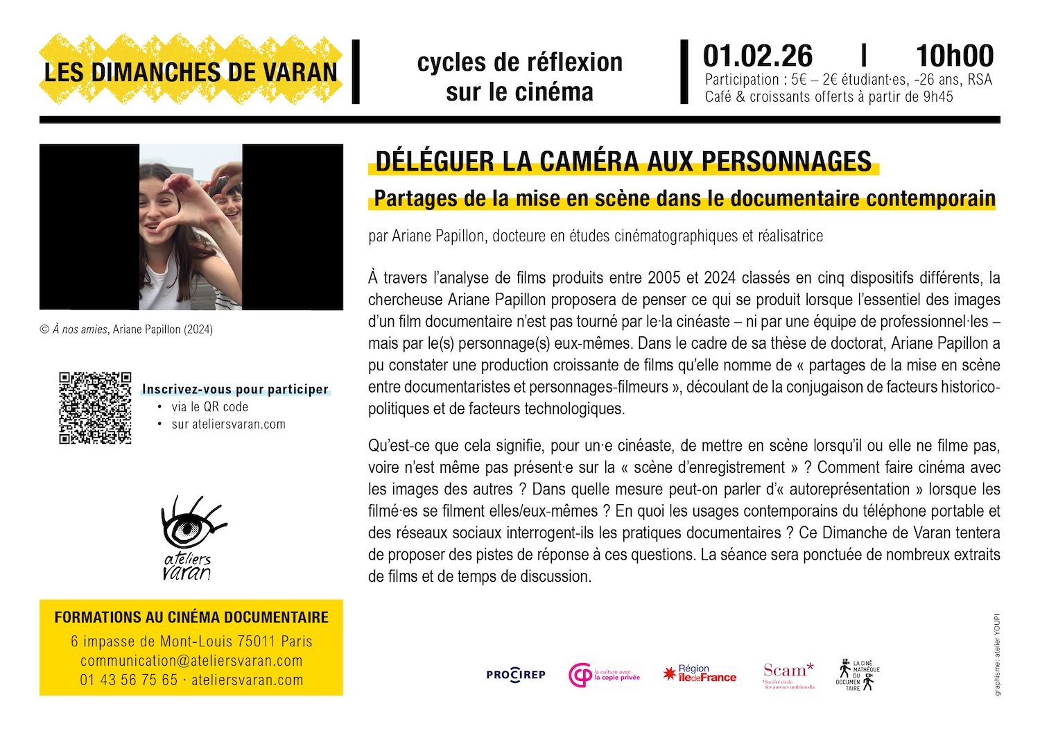 Qu'est-ce que cela signifie, pour un e cinéaste, de mettre en scène lorsqu'il ou elle ne filme pas, voire n'est même pas présente sur la « scène d'enregistrement » ? Comment faire cinéma avec les images des autres ? Dans quelle mesure peut-on parler d'« autoreprésentation » lorsque les filmé·es se filment elles/eux-mêmes ? En quoi les usages contemporains du téléphone portable et des réseaux sociaux interrogent-ils les pratiques documentaires ? Ce Dimanche de Varan tentera de proposer des pistes de réponse à ces questions. La séance sera ponctuée de nombreux extraits de films et de temps de discussion.
