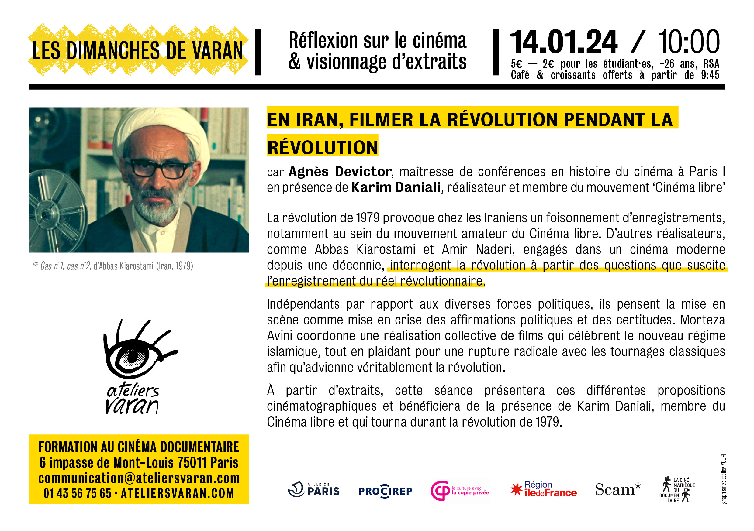 À partir d’extraits, cette séance présentera ces différentes propositions cinématographiques et bénéficiera de la présence de Karim Daniali, membre du Cinéma libre et qui tourna durant la révolution de 1979.