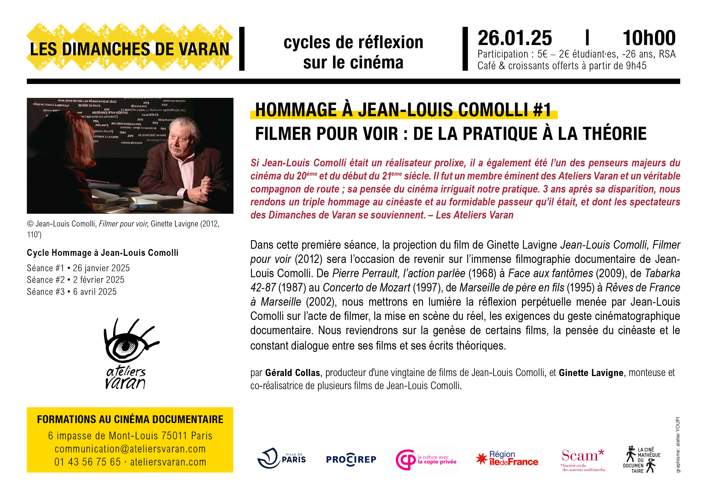 Si Jean-Louis Comolli était un réalisateur prolixe, il a également été l’un des penseurs majeurs du cinéma du 20ème et du début du 21ème siècle. Il fut un membre éminent des Ateliers Varan et un véritable compagnon de route ; sa pensée du cinéma irriguait notre pratique. 3 ans après sa disparition, nous rendons un triple hommage au cinéaste et au formidable passeur qu’il était, et dont les spectateurs des Dimanches de Varan se souviennent. – Les Ateliers Varan